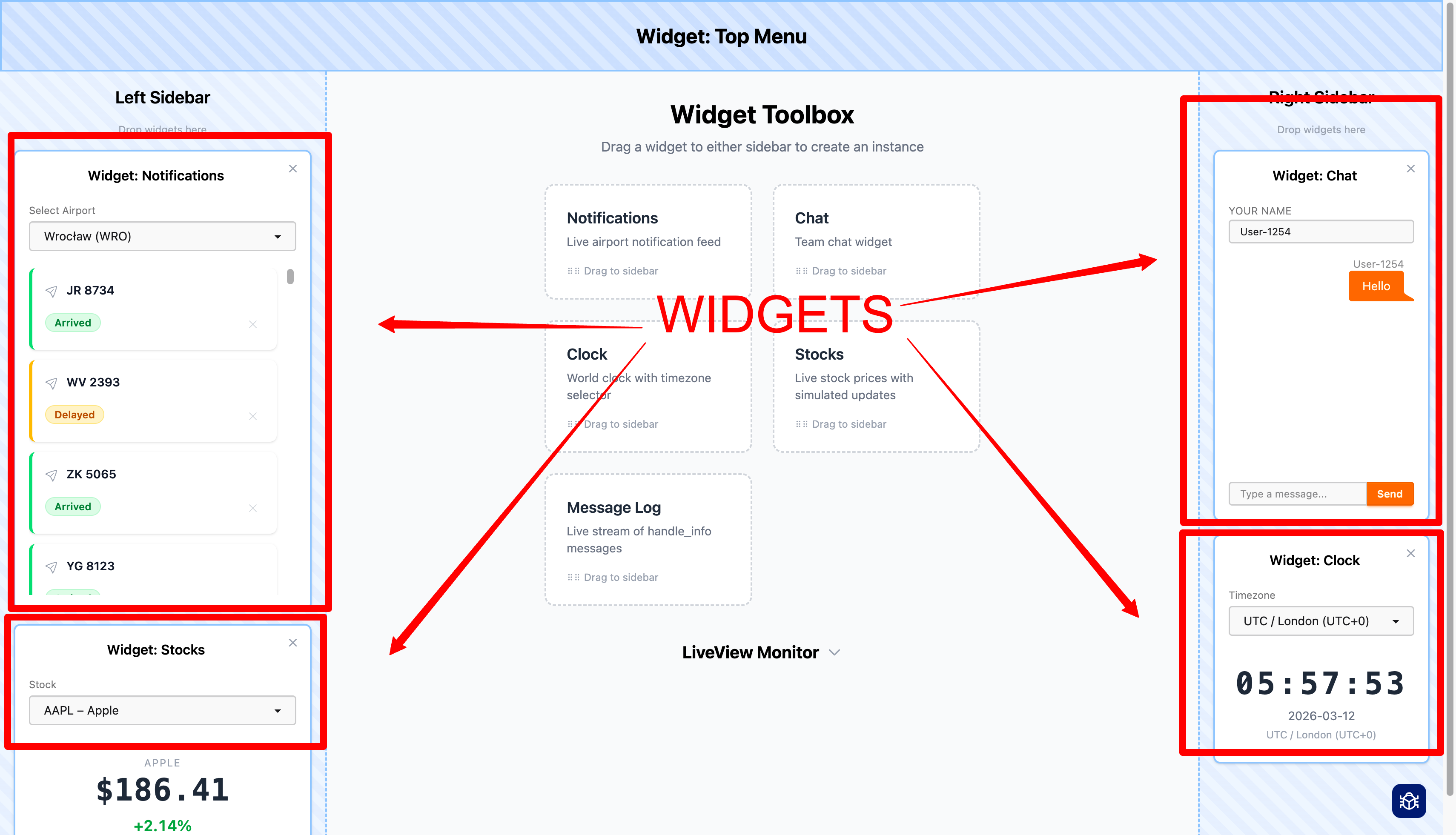 💡 Widget hooks should only modify the state of the widget instances. Since hooks plug directly into the LiveView lifecycle, they have access to the full socket assigns - but modifying anything outside their own state breaks decoupling and makes debugging significantly harder - technically possible, but a clear code smell.