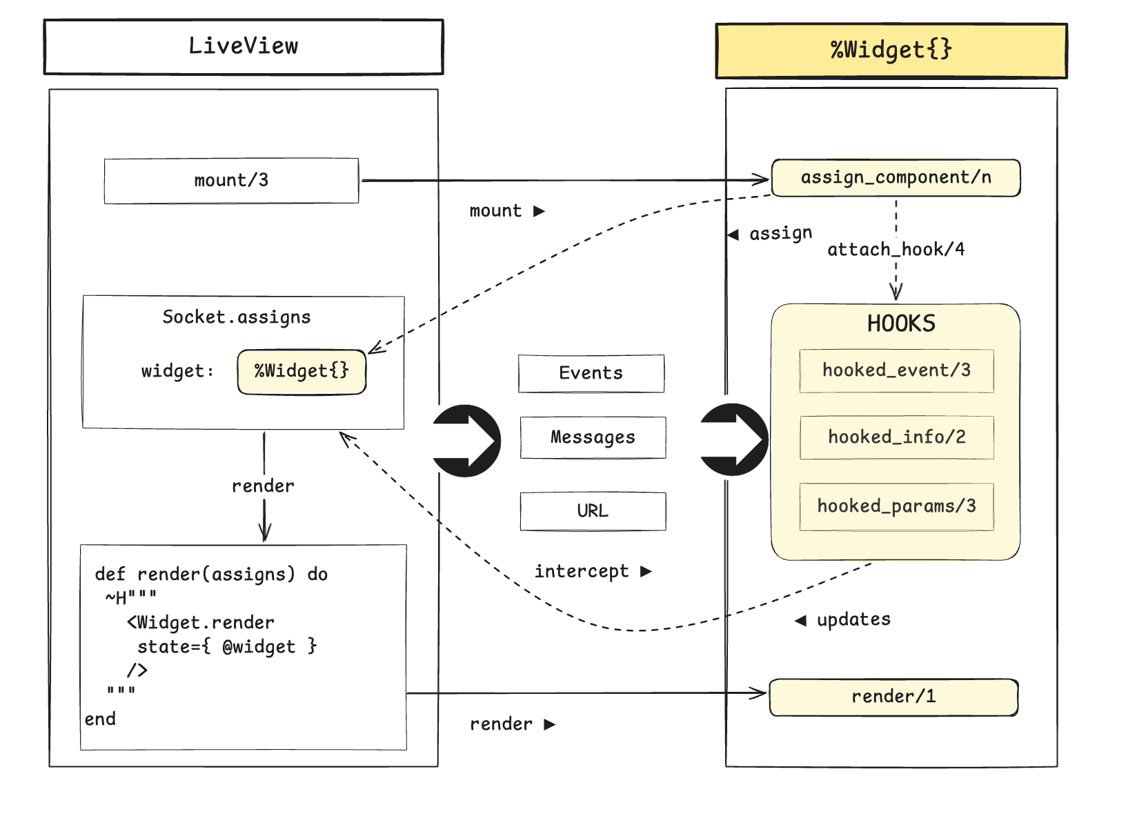 %struct{}and eventually stored directly in the parent LiveView'ssocket.assigns— there is no hidden internal state, no separate process, no session serialisation. - LiveView Hooks — the widget plugs into the parent's lifecycle through