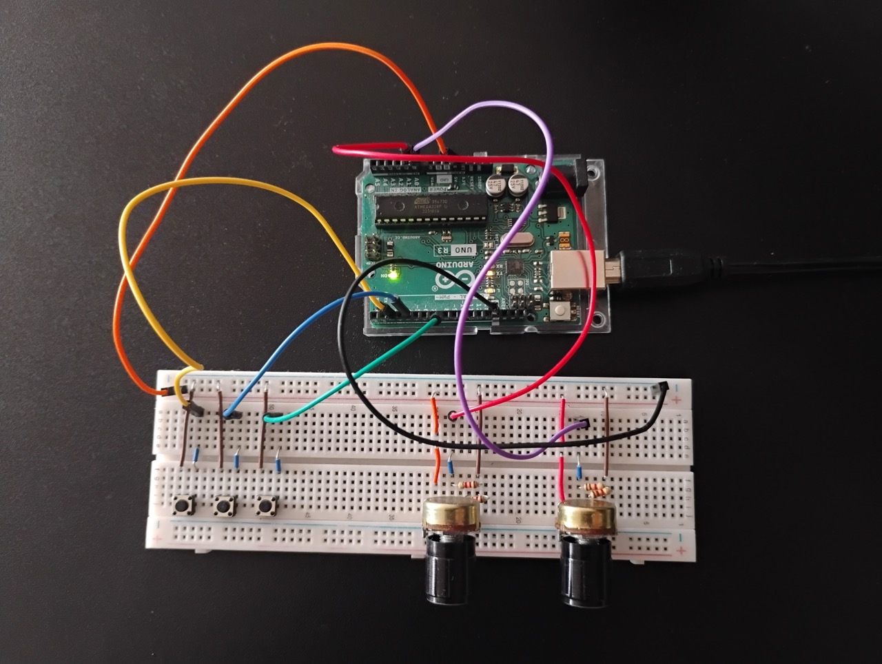 Potentiometers present a different challenge. Their full range is 0-1023, so we can’t detect a failure by extreme values alone. The solution: add a series resistor between the potentiometer’s ground pin and GND. This way, we create a voltage divider, ensuring the reading stays above a given minimum value. I used the 2.2 kΩ resistor, which sets the minimum reading at ~30. It reduces the potentiometer’s effective range to 30-1023, but that’s negligible for controlling musical parameters such as release time.