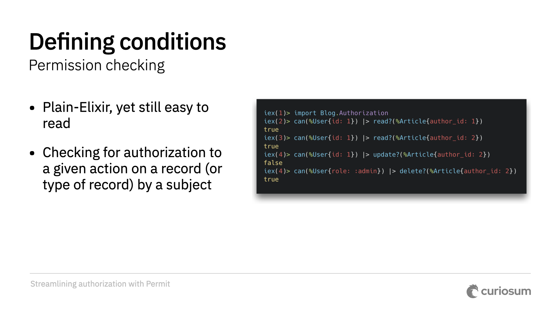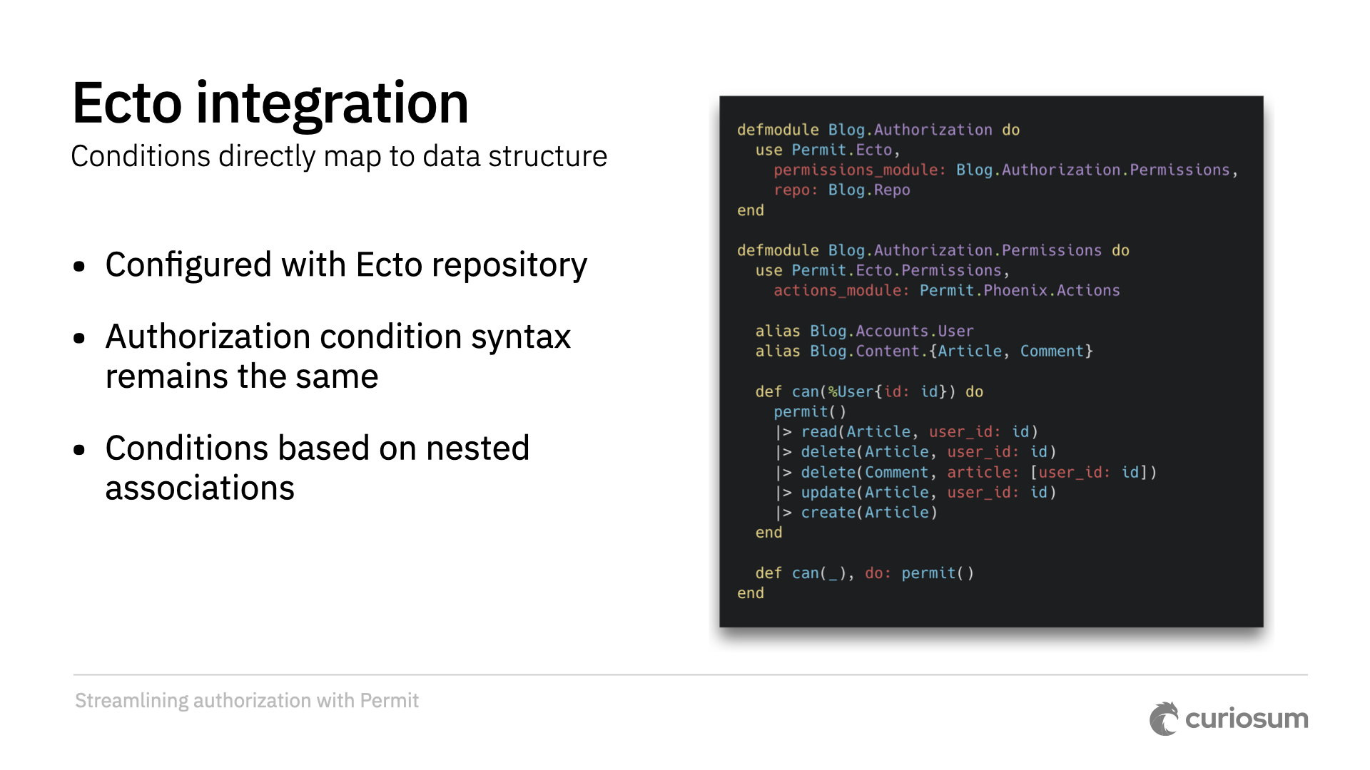 Permit combined with Ecto facilitates DB-backed authorization. This is not about native Postgres role-level security, though we may explore that later. Because conditions are given as keyword lists, we can automatically construct Ecto queries out of them.