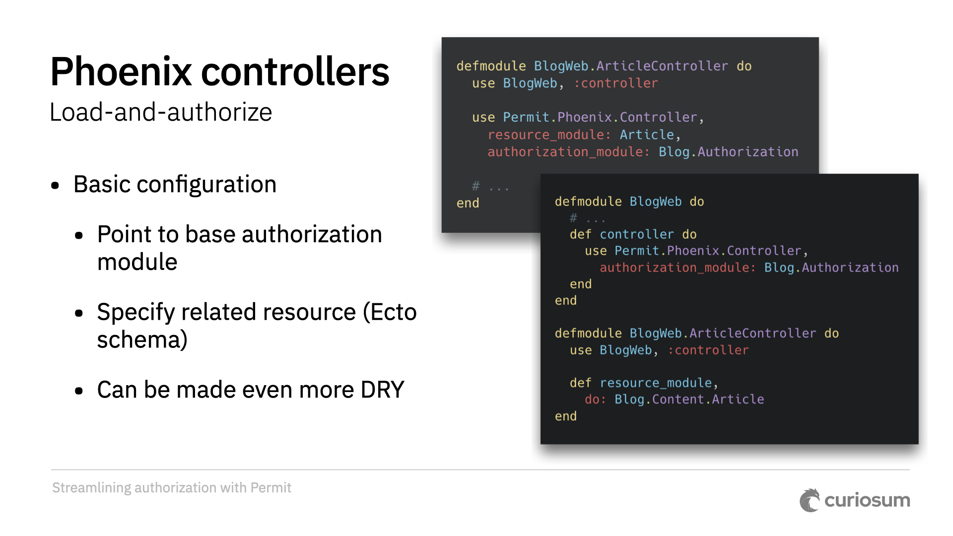 Next is Permit Phoenix, for DRY authorization in controllers. We want to avoid copy-pasting boilerplate and forgetting to authorize an action. We also don't want to mix authorization rules with controller code or filter records inefficiently. The "load and authorize" pattern is facilitated by plugging it into the controller and pointing to your authorization module.