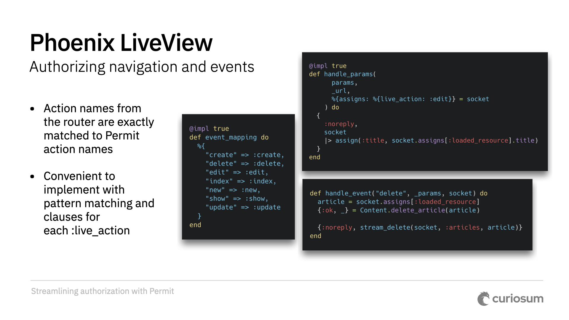 For LiveView, we authorize navigation and events by hooking into the router with the Permit.Phoenix.LiveView.AuthorizeHook