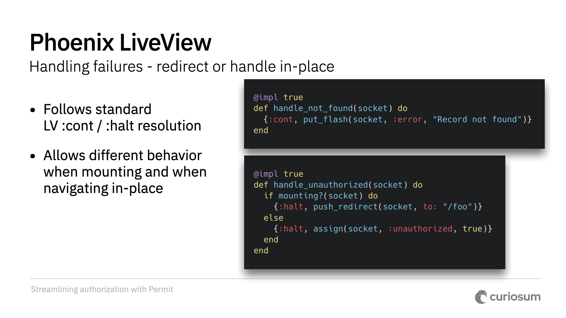 For example, the edit live action is mapped to the edit permit action. When handling events, authorization is based on this mapping, and the loaded resource is put into assigns. Failure handling follows standard LiveView conventions using cont