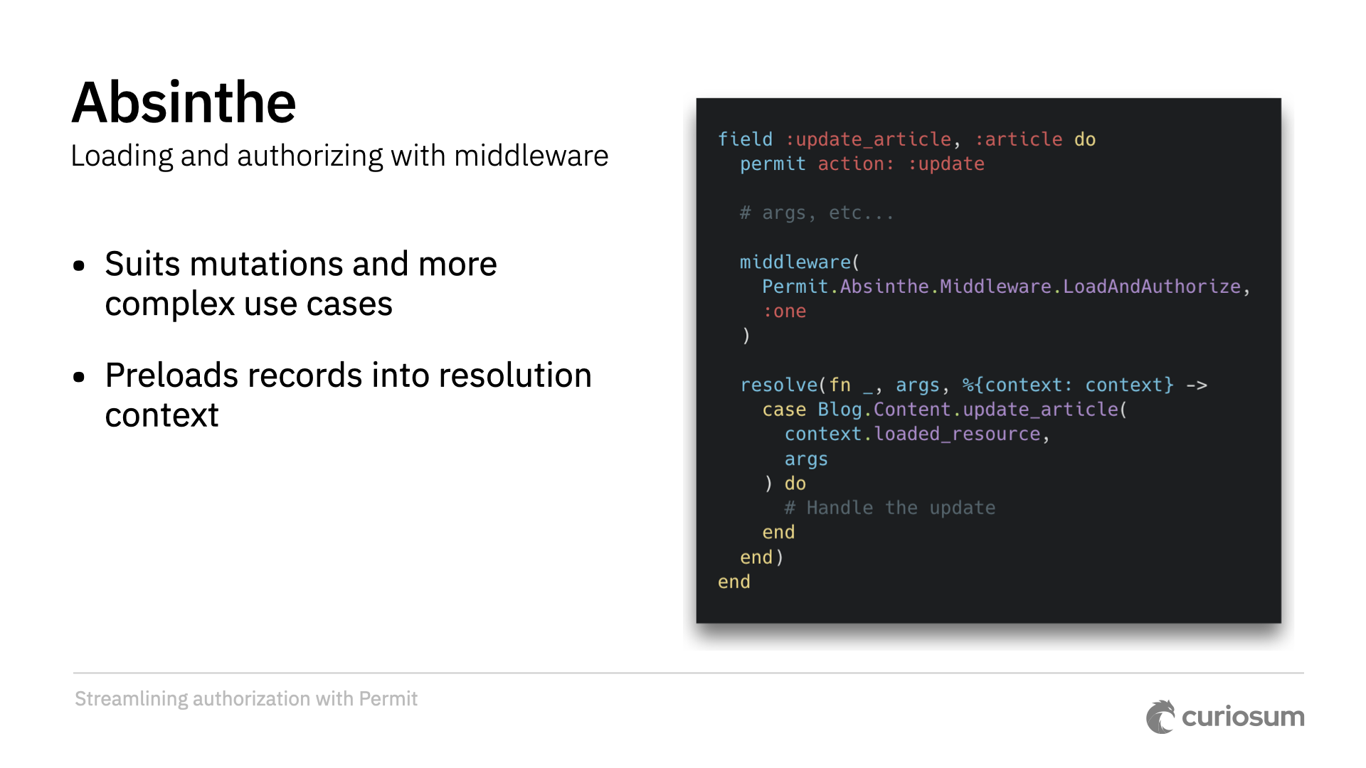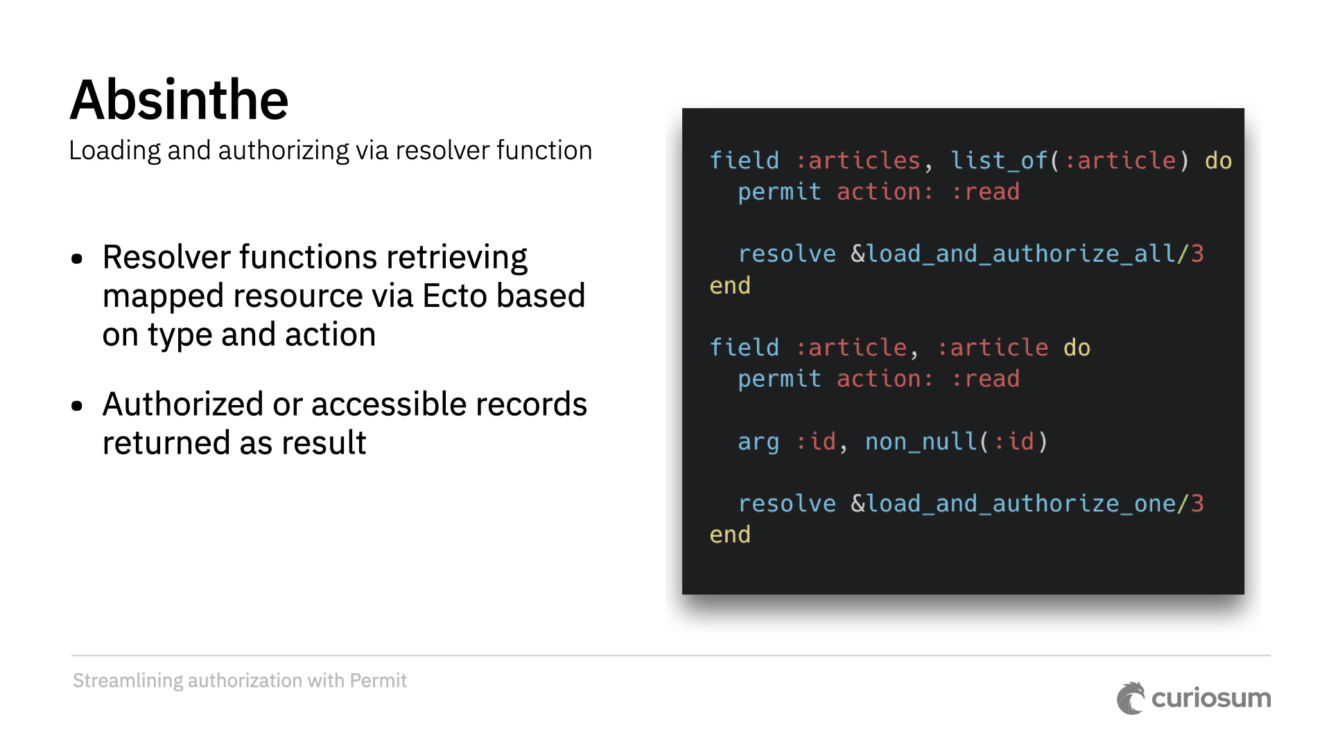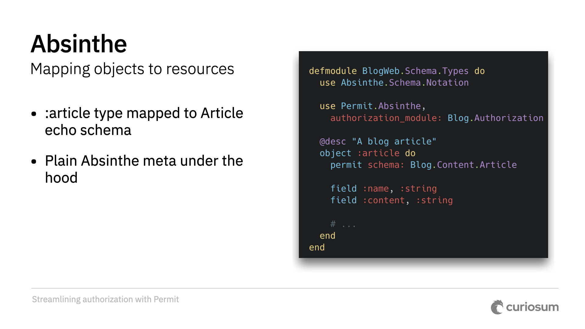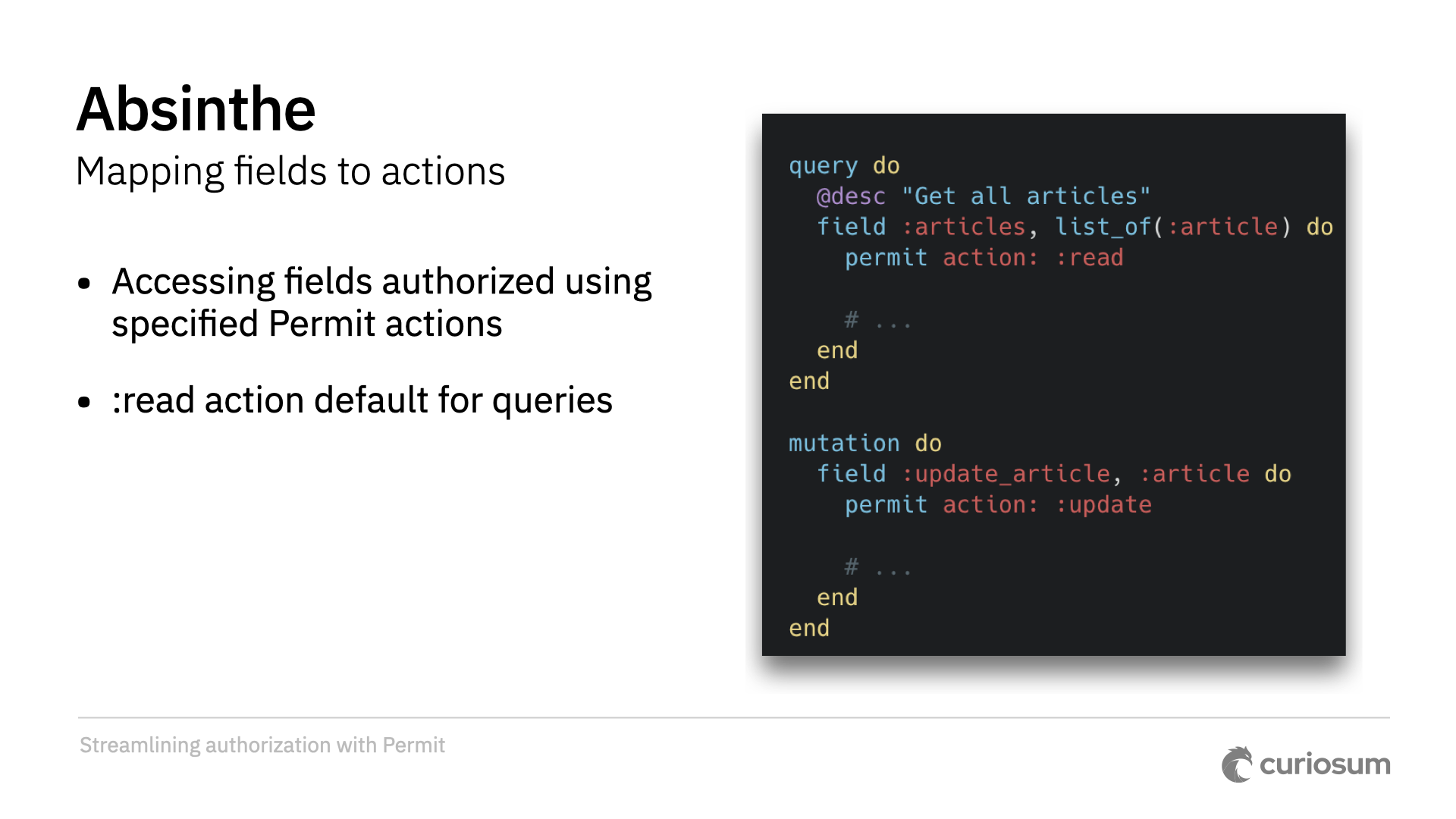 The upcoming Permit Absinthe is a tool for authorizing access in GraphQL APIs. This was challenging due to GraphQL's structure of queries and mutations. The approach is to first map an object type to an Ecto schema. Then, we map fields to actions in both queries and mutations. Query fields will mostly map to the read