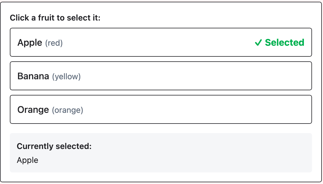 {id: 2, name: "Banana"}(different reference!) selected == fruitcompares:old_banana_ref == new_banana_ref→false- Checkmark disappears even though the data is the same!